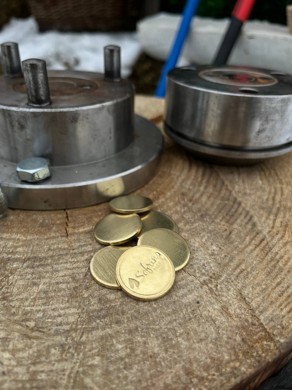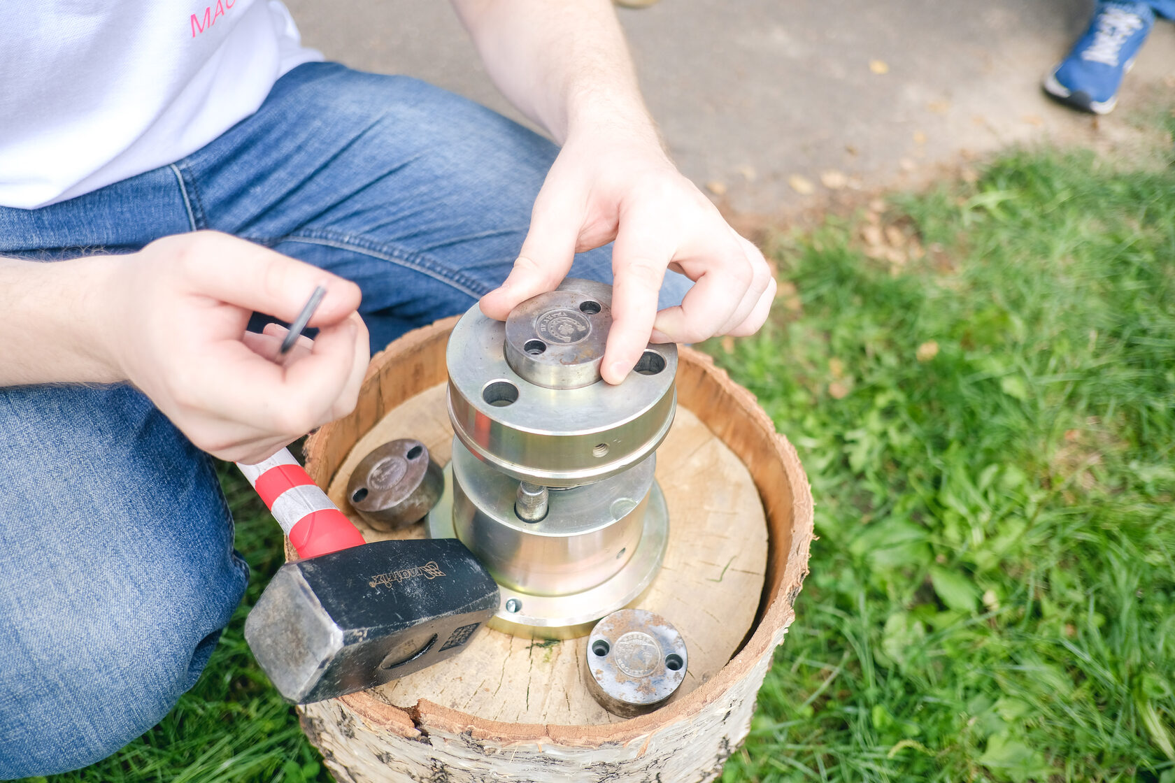 Суть мастер-класса. Мастер помещает заготовку в чеканную установку. Затем участник(или сам мастер) один или несколько раз бьет молотом по ней, после чего извлекается готовую монету.